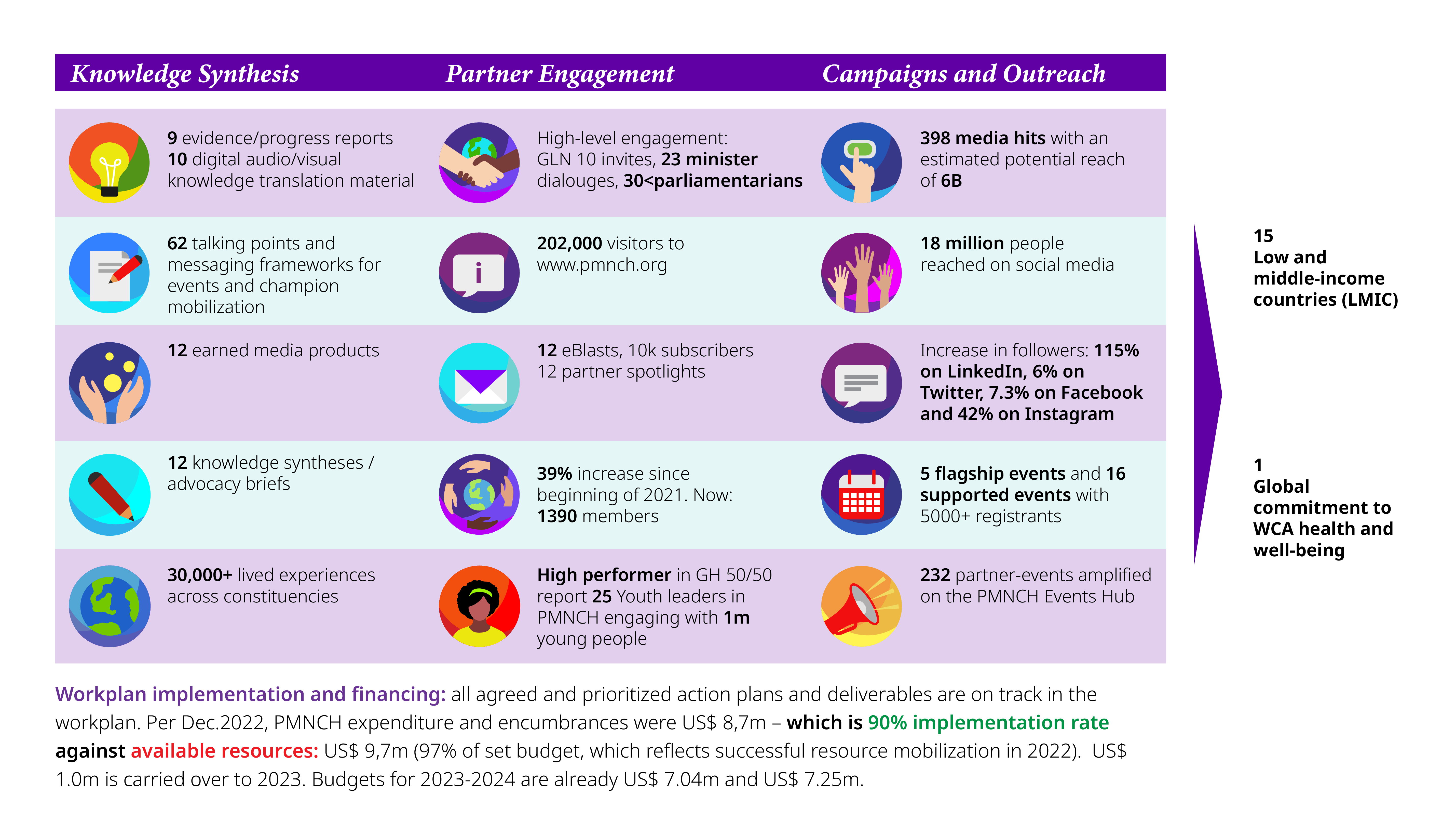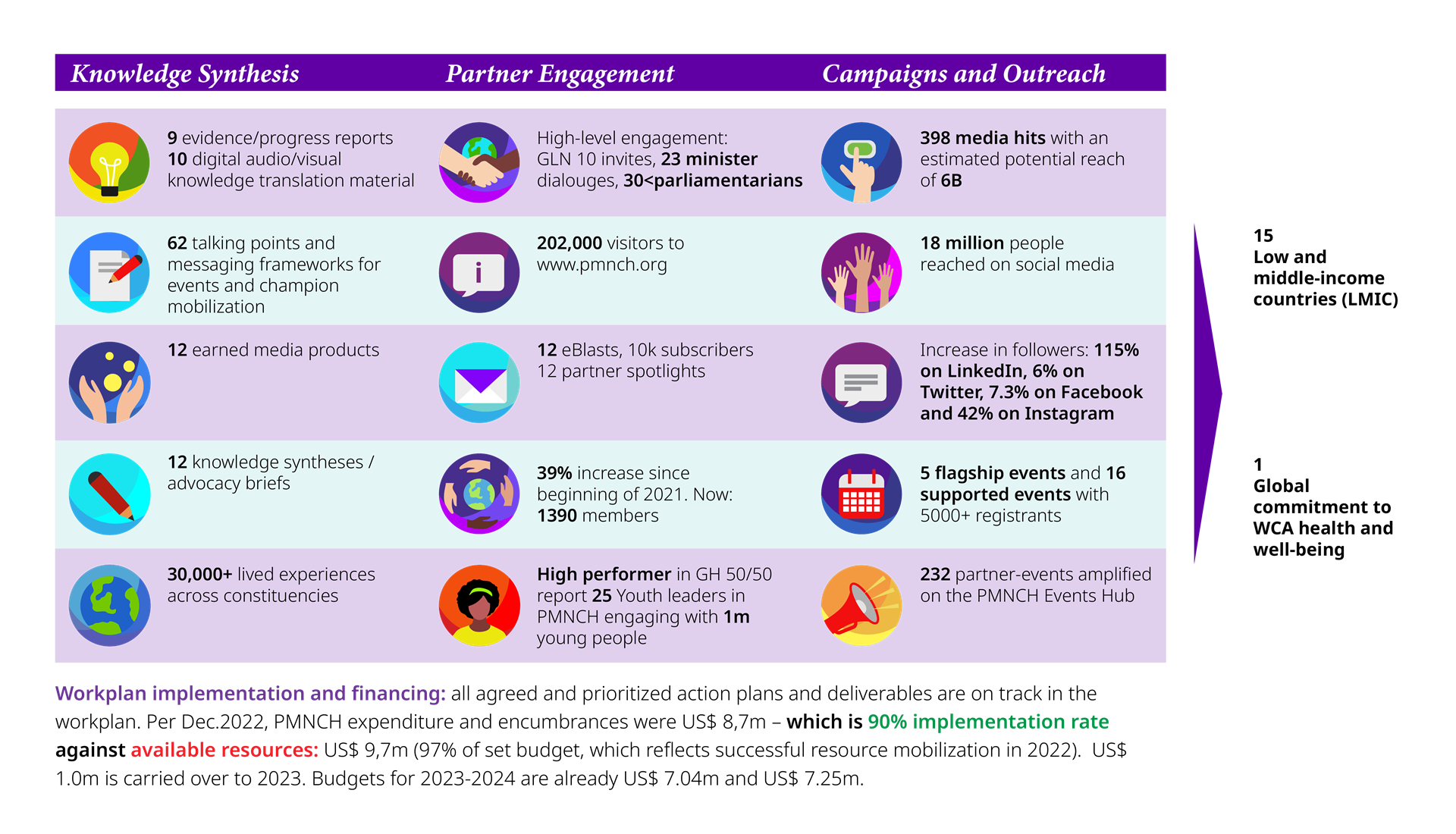Workplan implementation and financing: all agreed and prioritized action plans and deliverables are on track in the workplan. Per Dec.2022, PMNCH expenditure and encumbrances were US$ 8,7m – which is 90% implementation rate against available resources: US$ 9,7m (97% of set budget, which reflects successful resource mobilization in 2022). US$ 1.0m is carried over to 2023. Budgets for 2023-2024 are already US$ 7.04m and US$ 7.25m.