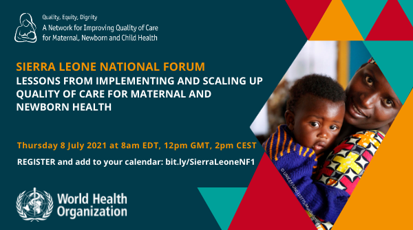 In March 2021, Sierra Leone hosted a National Forum to discuss progress and share examples and experiences of implementing Quality Care for Maternal, Newborn and Child Health. This webinar will document and share the challenges, practical solutions and lessons learned by Sierra Leone in implementing and scaling up quality of care for MNH. This session will provide an opportunity for exchange between policy makers, managers and providers at national level, as well as among Network countries and with broader partners.