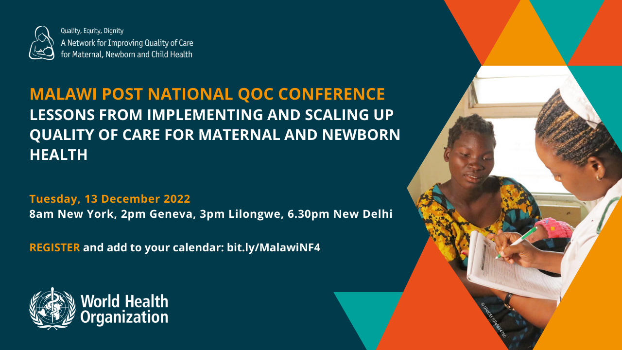 In October 2022, Malawi hosted a National Quality of Care Conference under the theme 'Investing in Quality Health Care: A roadmap to Achieving Universal Health Coverage and Sustainable Development Goals'. This conference aimed to discuss progress, share experiences and document successes, challenges, best practices & innovations in implementing maternal and newborn health quality of care initiative in Malawi, and agree on next steps and plans for scale up. This webinar will document and share experiences, challenges, practical solutions and lessons learned by Malawi in implementing and scaling up quality of care for MNH, as concluded in the conference. This session will provide an opportunity for exchange between policy makers, managers and providers at national level, as well as among Network countries and with broader partners.