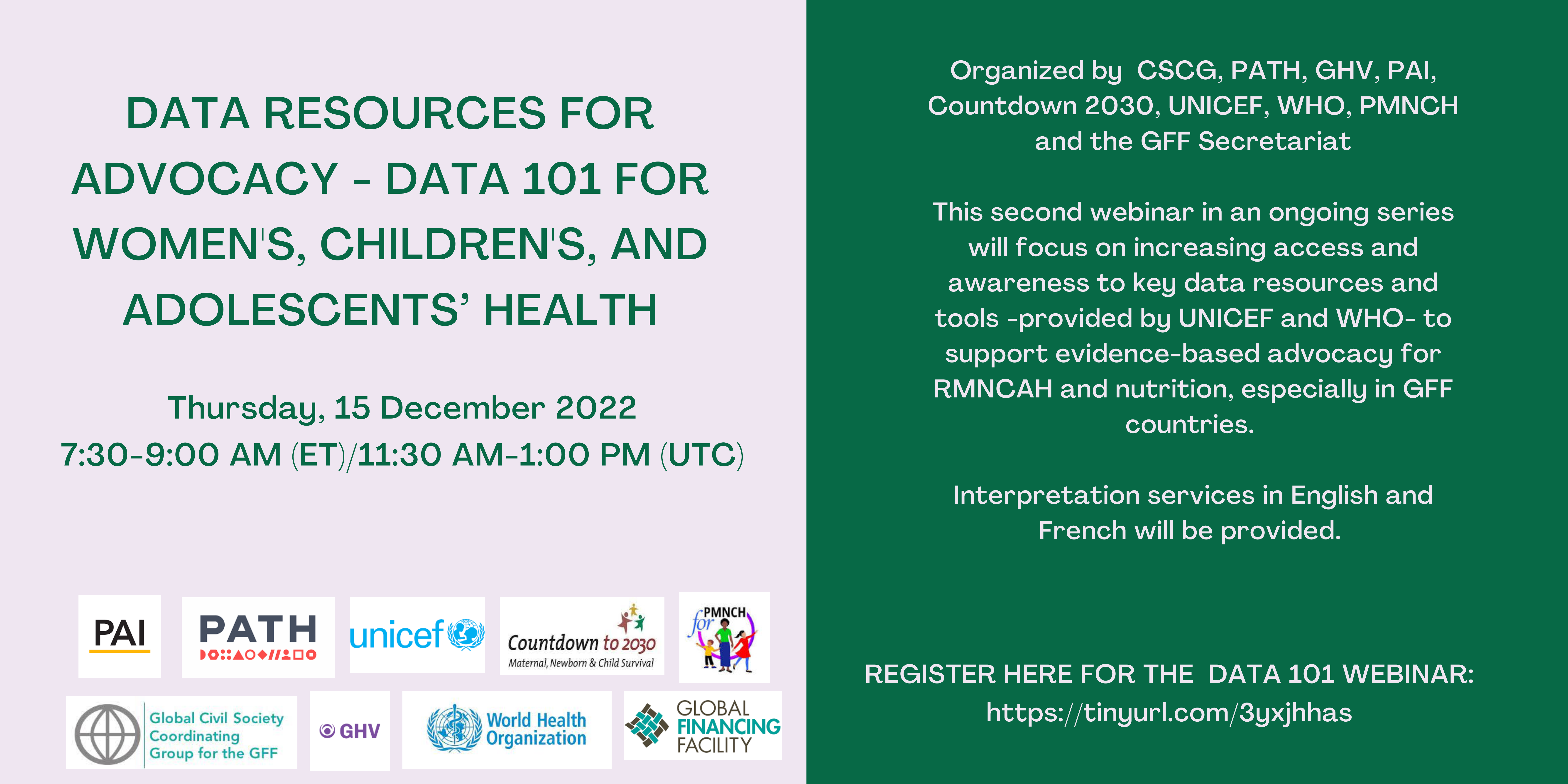 This second webinar of a two-part series will focus on increasing access and awareness to key data resources and tools -provided by UNICEF and WHO- to support evidence-based advocacy for RMNCAH and nutrition, especially in GFF countries.