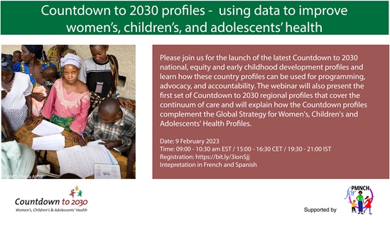 Please join us for the launch of the latest Countdown to 2030 national, equity and early childhood development profiles and learn how these country profiles can be used for programming, advocacy, and accountability. The webinar will also present the first set of Countdown to 2030 regional profiles that cover the continuum of care and will explain how the Countdown profiles complement the Global Strategy for Women's, Children's and Adolescents' Health Profiles.