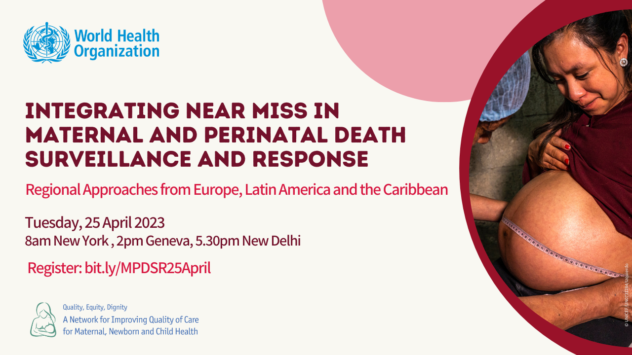 The Department of Maternal, Newborn, Child and Adolescent Health and Ageing, WHO Geneva, the WHO Regional Office for Europe and the Pan American Health Organization are hosting a webinar to explore regional approaches for integrating Near Miss into Maternal and Perinatal Death Surveillance and Response (MPDSR) systems.