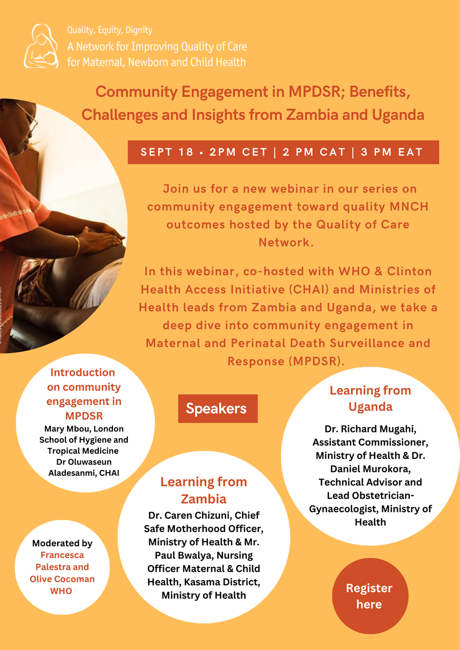 Join us for a the first in a new webinar series webinar hosted by the Quality of Care Network on community engagement toward quality MNCH outcomes. In this first webinar, co-hosted with WHO & Clinton Health Access Initiative (CHAI) we take a deep dive into community engagement in Maternal and Perinatal Death Surveillance and Response (MPDSR) with Ministries of Health leads from Zambia and Uganda, Mary Mbuo (LSHTM) will briefly discuss community engagement in MPDSR, and Dr. Oluwaseun Aladesanmi (CHAI) will set out the scope of work.