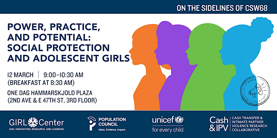 Girls’ economic wellbeing is critical to their overall wellbeing and safe transitions to adulthood. Social protection can turn the tide for adolescent girls by allowing families to invest in their health and education. There is particular promise in integrated social protection, such as the combination of cash transfers linked to additional services or programming. Open to the public, this event will feature a presentation of a systematic review on the impact of social protection on adolescent girls, case studies on successful cash-plus programs, and a panel discussion between government representatives, bi-laterals, multi-laterals, and researchers. The event is co-hosted by the Population Council’s GIRL Center, UNICEF, and the Cash Transfer and IPV Research Collaborative.