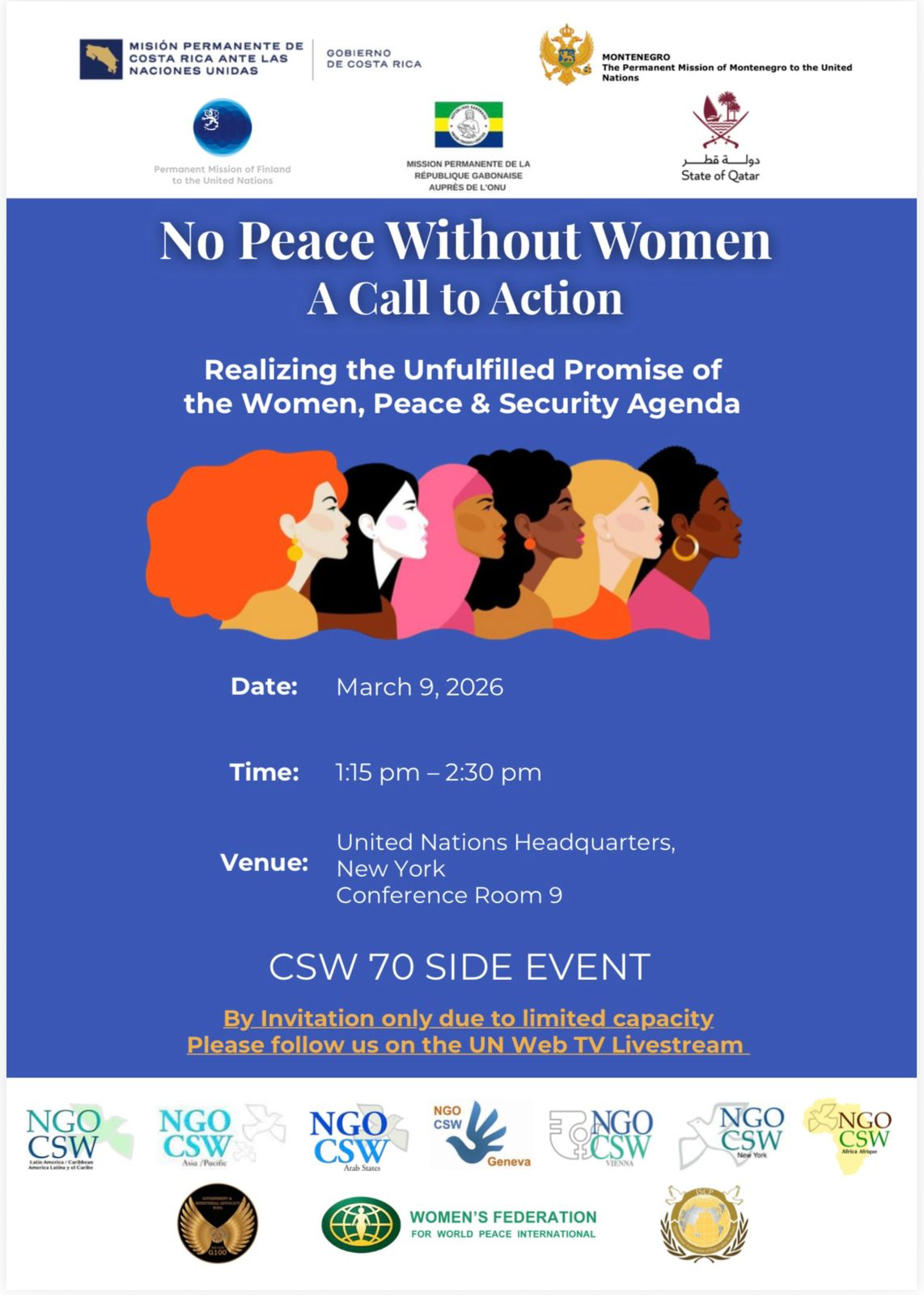 The event is by invitation only.Concept note - No peace without women, CSW side event