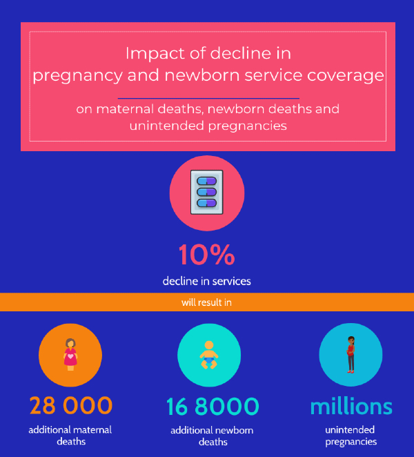 Maternal and newborn child mortality rates are expected to increase due to disruptions caused by COVID-19. WHO recommends that pregnancy and newborn health services are maintained. Early estimates suggested that even a modest decline of 10% in pregnancy and newborn service coverage would result in an additional 28 000 maternal deaths, 168 000 newborn deaths, and millions of unintended pregnancies1.