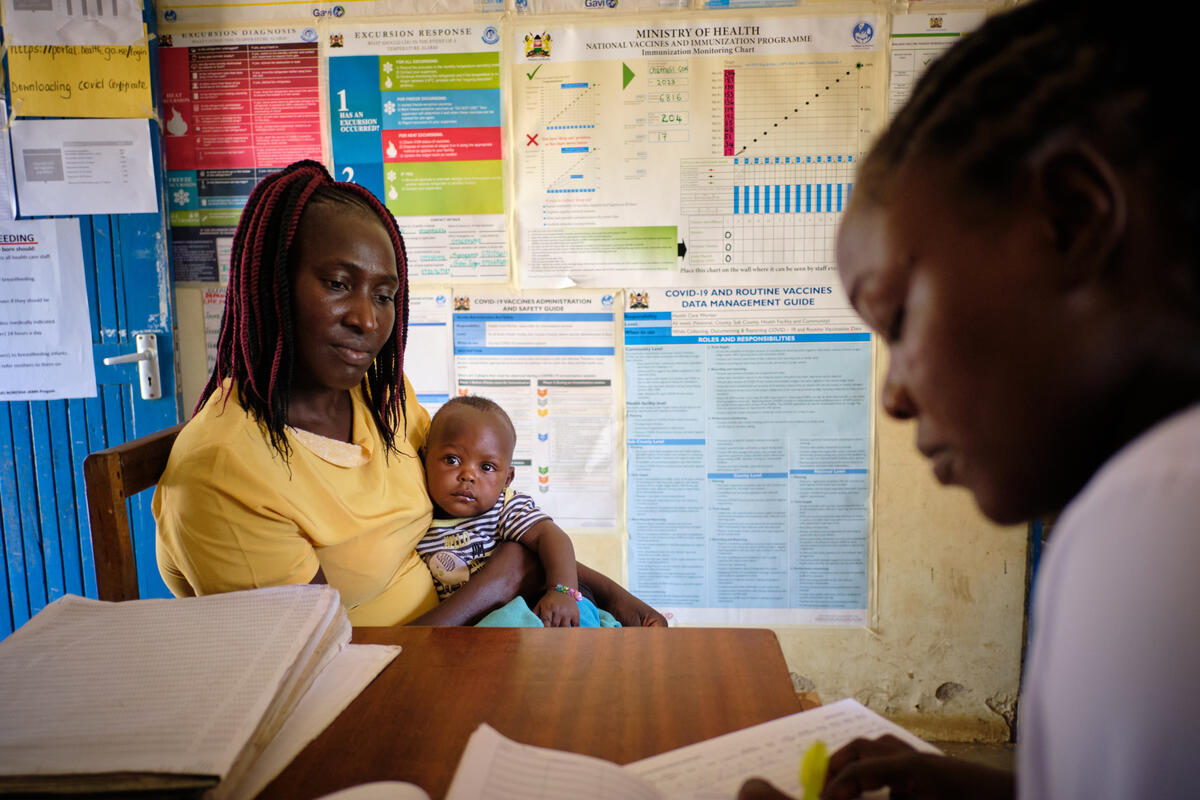 © WHO / Fanjan Combrink. A health worker fills in the Mother & Child booklet for Sarah and her 6-month-old grandson Adriane at the Chemelil Gok Health Centre in western Kenya.
