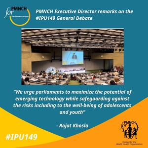 As part of its ongoing cooperation with Inter-Parliamentary Union (IPU), PMNCH actively participated in the IPU Assembly in Geneva, Switzerland from 13th -17th October 2024. The IPU Assembly is a biannual convening of IPU statutory bodies, including the Governing Council, Standing Committees, Committees on the Human Rights of Parliamentarians, as well as the Forum of Women Parliamentarians and the Forum of Young MPs to deliberate on key strategic and programmatic issue including identifying future priority areas of action by member parliaments. The central theme of this Assembly was "Harnessing science, technology and innovation (STI) for a more peaceful and sustainable future". The Geneva Declaration, which captures the outcomes of the general debate, has a strong equity focus, and gives visibility to the needs and considerations of women, young people and groups in vulnerable or marginalized situations in creating, developing, deploying and utilizing science, technology and innovation for the common good. The resolution is mindful to, both, the imperative of ethically maximizing the potential of these technologies as well as mitigating the risks, including the impacts on the well-being of youth.