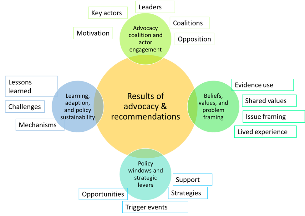 Advocacy policy research framework adapted from existing advocacy and policy process frameworks (e.g., Advocacy Coalition Framework – Sabatier & Jenkins-Smith, 1993; Kingdon’s Multiple Streams, 1995; and advocacy evaluation models – Coffman, 2009) to integrate elements of coalition building, agenda-setting, and assessment of advocacy outcomes.